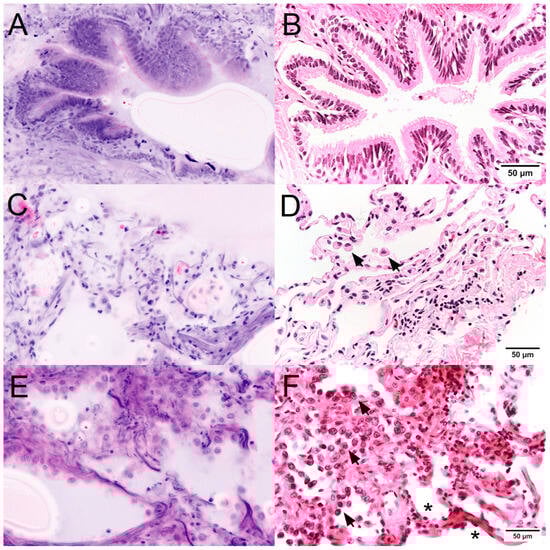 Malignancy in FCM scans (left) and conventional histology (right). Bronchial epithelia (A,B) were easily recognizable. The parenchyma (C,D) showed flattened or cuboidal pneumocytes and luminal macrophages (arrows). The clear presentation of nuclear features (E,F) favored the detection of neoplastic proliferations of atypical tumor cells (arrows) in comparison to nonneoplastic pneumocytes (*).