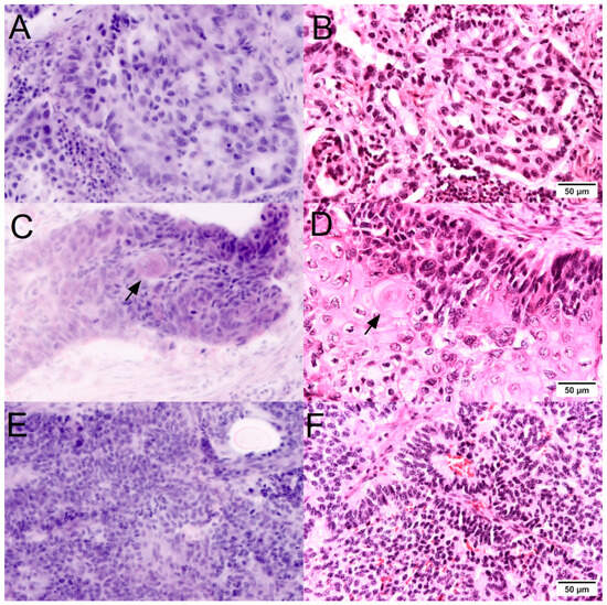 Lung tumors in FCM scans (left) and conventional histology (right). Characteristic lepidic and acinar growth patterns of adenocarcinomas (A,B) were easily recognizable in the FCM scans. Islets of keratinization (arrow) were well recognizable in squamous cell carcinomas (C,D) as round structures with a strong (red) signal in reflection mode. When present, the typical pepper-and-salt chromatin structure and so-called pseudo-rosettes were recognizable hallmarks of neuroendocrine tumors (E,F).