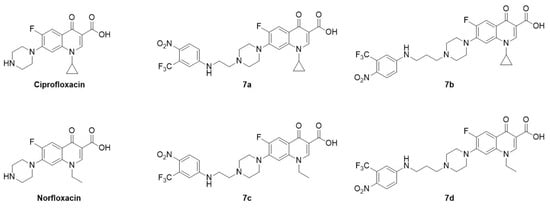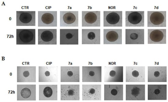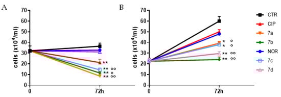 Briefly, cells were seeded in 96-well plates (2.5 × 104 cells/mL) and grown under standard conditions for 24 h. Cells were then treated with increasing concentrations of compounds under investigation (CIP and NOR 1–100 µM; 7a, 7b, 7c, and 7d 0.1–10 µM) and incubated for 72 h at 37 °C. At the end of this period, 50 µL of MTT (2 mg/mL in PBS) was added to each well, and plates were incubated for 3h before the solution was discarded and formazan crystals were solubilized in 100 µL of DMSO.