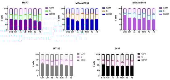 Cell cycle distribution of MCF7, MDA-MB231, MDA-MB453, RT112, and 5637 cells following 72 h treatment with CIP, NOR, and their derivatives at concentrations corresponding to the IC50 values reported in Table 1 (mean ± S.D. of three independent experiments).