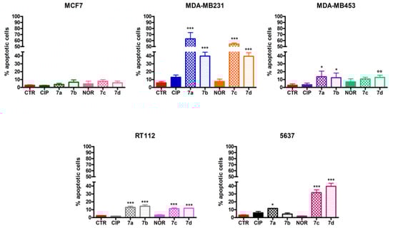 Differently from CIP and NOR, which did not promote apoptosis in any of the investigated cell lines, the derivatives induced apoptotic cell death to different extents in MDA-MB231, MDA-MB453, RT112, and 5637 cell lines. Specifically, all derivatives significantly induced apoptosis in MDA-MB231 and RT112 cells, with higher percentages of apoptotic cells observed in the former. At the same time, only 7a, 7b, and 7d were able to trigger apoptotic cell death in MDA-MB453, while 7a, 7c, and 7d were the most active compounds in 5637 cells. None of the derivatives induced apoptosis in MCF7 cells (Figure 5).