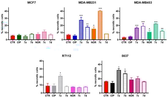 Percentage of necrotic MCF7, MDA-MB231, MDA-MB453, RT112, and 5637 cells following 72 h treatment with CIP, NOR, and their derivatives at concentrations corresponding to the IC50 values reported in Table 1 (mean ± S.D. of three independent experiments; * p < 0.05, ** p < 0.01; *** p < 0.001 vs. CTR and CIP or NOR; ° p < 0.05, °° p < 0.01 vs. CTRL).