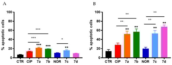 Percentage of apoptotic cells from MCF7 (A) and RT112 (B) spheroids following 72 h treatment with CIP, NOR, and their derivatives at concentrations corresponding to the IC50 values reported in Table 1 (mean ± S.D. of three independent experiments; * p < 0.05, ** p < 0.01, *** p < 0.001 vs. CTR; ° p < 0.05, °° p < 0.01, °°° p < 0.001).