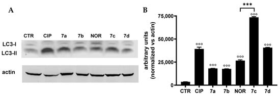 LC3-II protein levels ((A) representative Western blot analysis out of two independent experiments with similar results) in MCF7 cells treated 72 h with CIP, NOR, and their derivatives at concentrations corresponding to the IC50 values reported in Table 1, and relative densitometric analysis performed in all Western blot experiments (B) (mean ± S.D. of two independent experiments; °°° p < 0.001 vs. CTR; *** p < 0.001). The uncropped bolts are shown in Supplementary Materials.