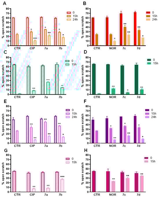 Percentages of open scratches in MDA-MB231 (A,B), MDA-MB453 (C,D), RT112 (E,F), and 5637 (G,H) cells following treatment with 7a, 7b, 7c, and 7d and their precursors CIP or NOR (mean ± S.D. of three independent experiments; * p < 0.05; ** p < 0.001; *** p < 0.001 vs. CTR and CIP or NOR; ° p < 0.05; °° p < 0.01; °°° p < 0.001 vs. CTR).