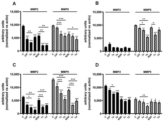 MMP2 and MMP9 protein levels in MDA-MB231 (A), MDA-MB453 (B), RT112 (C), and 5637 (D) cells following treatment with 7a, 7b, 7c, and 7d and their precursors CIP or NOR. Densitometric analysis was performed using ImageJ 1.53e software (mean ± S.D. of two independent experiments; ° p < 0.05; °° p < 0.01; °°° p < 0.001 vs. CTR; * p < 0.05, ** p < 0.01, *** p < 0.001). Representative Western blots are reported in Figure S2.