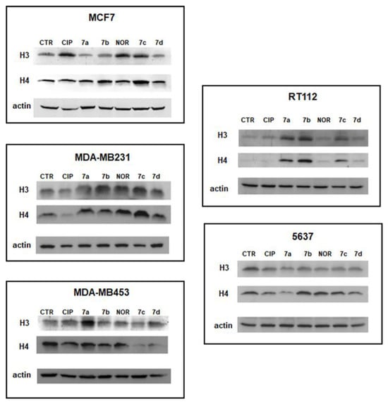 For a simpler observation of these results, Table S2 summarizes the ability of 7a–d, CIP, and NOR to increase H3 and/or H4 protein levels in the five cell lines considered.