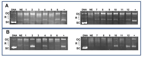 DNA relaxation assay for topoisomerase activity in MCF7 (A) and RT112 (B) nuclear extracts (OC: nicked, open circular DNA; R: relaxed DNA; SC: supercoiled DNA. Lines legend: DNA: pBR322 supercoiled plasmid; NE: nuclear extracts; 1: NE + CIP 10 µM; 2: NE + CIP 100 µM; 3: NE + 7a 10 µM; 4: NE + 7a 100 µM; 5: NE + 7b 10 µM; 6: NE + 7b 100 µM; 7: NE + NOR 10 µM; 8: NE + NOR 100 µM; 9: NE + 7c 10 µM; 10: NE + 7c 100 µM; 11: NE + 7d 10 µM; 12: NE + 7d 100 µM; +: positive control (DMSO > 10%). The uncropped bolts are shown in Supplementary Materials.