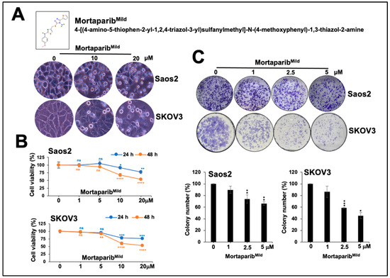 Cytotoxicity of MortaparibMild in p53-null cells. (A) Chemical structure of MortaparibMild is shown. Cells treated with MortaparibMild for 48–72 h showed apoptotic morphology. (B) MTT assay showed dose-dependent cytotoxicity in both Saos2 and SKOV3 cells. (C) Clonogenicity of control and treated cells as determined by colony forming assay showing dose-dependent decrease in MortaparibMild-treated group. Quantification of data from three replicates with p-values calculated by unpaired Student’s t-test is shown; p ≥ 0.05 (ns), p ≤ 0.05 (*), p ≤ 0.01 (**), p ≤ 0.001 (***), p ≤ 0.0001 (****) represent non-significant, significant, very significant, highly significant, and extremely significant, respectively.