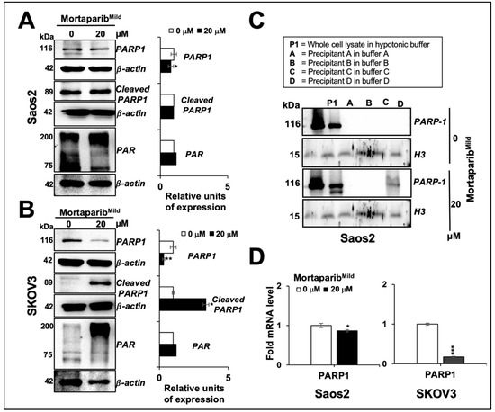 MortaparibMild-treated p53-null cancer cells were first examined for the expression level of mortalin. As shown in Figure 2A,B, Western blotting and immunostaining on control and MortaparibMild-treated Saos2 and SKOV3 cells showed a decrease in mortalin upon treatment with MortaparibMild. Furthermore, mortalin mRNA showed a decrease that was more pronounced in SKOV3 than Saos2 cells (Figure 2C). Similar to mortalin, PARP1 expression was reduced in MortaparibMild-treated Saos2 cells (Figure 3A). It was comparable to the p53 wild-type cells reported earlier [28] and particularly showed a remarkable decrease in SKOV3 cells with a significant increase in cleaved PARP1 (Figure 3B). DNA trapping assay endorsed the attenuation of PARP1 activity in MortaparibMild-treated Saos2 (Figure 3C). PARP1-RTqPCR showed a higher reduction in PARP1 mRNA in SKOV3 cells (Figure 3D) that was consistent with the results on protein expression.