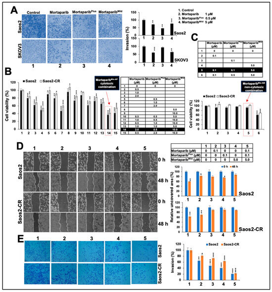 Three Mortaparibs showed comparable anti-invasion activity. (A) Invasion assay with non-toxic doses of three Mortaparibs in Saos2 and SKOV3 showed inhibition in treated compared to control groups. Quantitation of data is shown on right. (B) Viability of Saos2 and its drug-resistant derivative cell line treated with each of three Mortaparibs (#1–9) and their mixtures (#10–15); #14 showed higher cytotoxicity to both cell types. (C) Viability of cells treated with low doses of Mortaparibs (#1–4) and their mixture (#5–6); #5 was selected as non-toxic mixture. p-values were calculated using unpaired Student’s t-test. * ≤ 0.05, ** ≤ 0.01, and *** ≤ 0.001 represent significant, very significant, and highly significant, respectively. (D) Wound scratch assay in Saos2 and Saos2-CR cells treated with non-toxic doses of three Mortaparibs and their mixture. (E) Cell invasion assay in Saos2 and Saos2-CR cells treated with non-toxic doses of three Mortaparibs and their mixture. Mixture #5 showed higher anti-migration and anti-invasion activity. Data (mean ± SD) were obtained from three independent biological replicates. p-values were calculated using unpaired Student’s t-test. * ≤ 0.05, ** ≤ 0.01, and *** ≤ 0.001 represent significant, very significant, and highly significant, respectively.