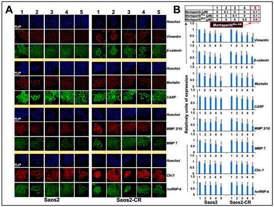 Based on previous reports [25,26,27,28] showing that MortaparibMild has lower cytotoxicity compared to the other two Mortaparibs, as well as current findings demonstrating its effect on p53-null cells and its significant anti-migration activity at low non-toxic concentrations, we hypothesize that a combination of the three Mortaparibs may provide improved anti-proliferative and anti-migration effects. Such specific combinations may be used to inhibit cancer progression and metastasis, respectively. Various combinations with different ratios of the three Mortaparibs were generated and evaluated for cytotoxicity by MTT assay. At the same time, we also generated cisplatin resistance derivatives of Saos2 cells (Saos2-CR) and examined their response to the Mortaparibs and their mixers. As presented in Supplementary Figure S4A, these derivative cells showed about 20% resistance to cisplatin. However, they responded to the three Mortaparibs almost similarly to the control cells (Figure 5B), also endorsed by the Cyclin D1 and C-Myc immunostaining of control and Mortaparib-treated Saos2 and Saos2-CR cells. As shown in Supplementary Figure S4B, both cells showed equivalent decreases in Cyclin D1 and C-Myc proteins. Based on the MTT-based viability assay of cells treated with either the individual Mortaparibs or their combinations, we identified an anti-proliferative (cytotoxic) combination (#14; called MortaparibMix-AP containing 2 μM Mortaparib–0.5 μM MortaparibPlus–10 μM MortaparibMild) (Figure 5B). The MortaparibMix-AP combination showed a synergetic cytotoxic effect as determined by Chou–Talalay’s combination index (CI = 0.81 for Saos2 and 0.74 for Saos2-CR cells). Furthermore, based on our earlier studies and the anti-migration data of MortaparibMild, as shown in Figure 4, we generated a low-dose non-toxic combination (#5; called MortaparibMix-AM containing 0.1 μM Mortaparib–0.1 μM MortaparibPlus–5 μM MortaparibMild) that did not show any cytotoxicity to either Saos2 or Saos2-CR (Figure 5C) and examined its effect on the cell migration and invasion capability of these cells. As shown in Figure 5D,E, the MortaparibMix-AM combination showed a stronger inhibition (as compared to each of the Mortaparibs) of migration and invasion both in Saos2 and Saos2-CR cells; the CI for invasion was 0.29 and 0.34, respectively. Molecular analyses of the markers involved in migration and invasion (vimentin, β-catenin, mortalin, MMP3/10, MMP7, Clic-1, and hnRNP-k) indeed revealed a significantly higher decrease in cells treated with MortaparibMix-AM as compared to the ones treated with each of the Mortaparibs individually (Figure 6A,B). Of note, the Saos2-CR cells showed an equivalent response.