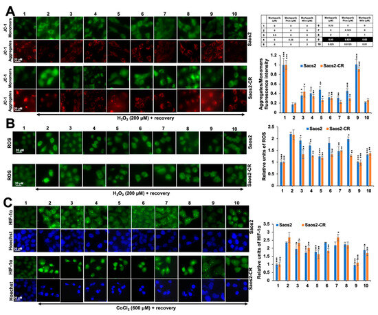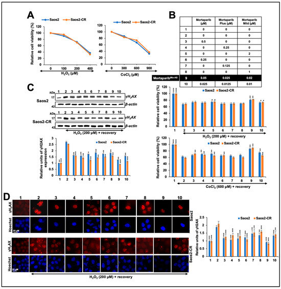 Based on our earlier findings that low doses of anticancer compounds have antistress activity [29], we next determined if the combination of Mortaparibs could provide antioxidative and anti-hypoxia stress activities. Initially, cells were challenged with H2O2 or CoCl2 to a level that caused ~ 30% reduction in viability upon recovery in the complete medium (Figure 7A). Based on these assays, 200 μM H2O2 and 600 μM CoCl2 were selected. Stressed cells were recovered in eight kinds of Mortaparib-supplemented medium. As shown in Figure 7, we identified a combination (#9, called MortaparibMix-AS containing 0.05 μM Mortaparib–0.025 μM MortaparibPlus–0.02 μM MortaparibMild) that caused a better recovery of cells challenged with either oxidative or heavy metal stress (Figure 7B). The combination showed a synergetic effect in both cell and stress types; the CI was <0.25 in each case. Molecular analyses of whole cell lysates of control and oxidatively stressed cells revealed an increase in γH2AX in the latter (Figure 7C). Stressed cells recovered in a medium supplemented with low non-toxic concentrations of Mortaparibs showed the attenuation of γH2AX increase. Of note, MortaparibMix-AS-treated cells showed a strong reduction and normalization of γH2AX (Figure 7C) and were supported by the immunostaining of γH2AX foci (Figure 7D). Similar protection against mitochondrial dysfunction and ROS accumulation was detected. Whereas oxidatively stressed cells showed the depolarization of the mitochondrial membrane (as determined by decreased red-JC1 staining) (Figure 8A) and accumulation of ROS (Figure 8B), cells recovered in the Mortaparib-supplemented medium showed recovery in both parameters. Of note, MortaparibMix-AS-treated cells showed the normalization of the mitochondrial membrane potential and ROS. Furthermore, the response of the Soas2-CR cells was similar to that of Saos2 (Figure 8A,B). We determined the HIF-1α expression level in cells exposed to CoCl2. As shown in Figure 8C, the CoCl2-induced increase in HIF-1α was attenuated in cells treated with Mortaparibs, leading to complete recovery in cells treated with MortaparibMix-AS.