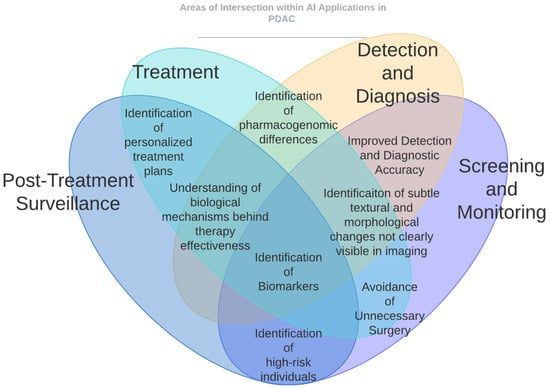 AI applications that intersect different aspects of patient care for PDAC. Identification of personalized treatment plans intersects Section 5 and Section 6. Identification of subtle textural and morphological changes not clearly visible in imaging intersects Section 2, Section 3, Section 4 and Section 5. Avoidance of unnecessary surgery intersects Section 2, Section 3, and Section 6. Understanding of biological mechanisms behind therapy effectiveness and identification of biomarkers intersect Section 2, Section 3, Section 4, Section 5 and Section 6.