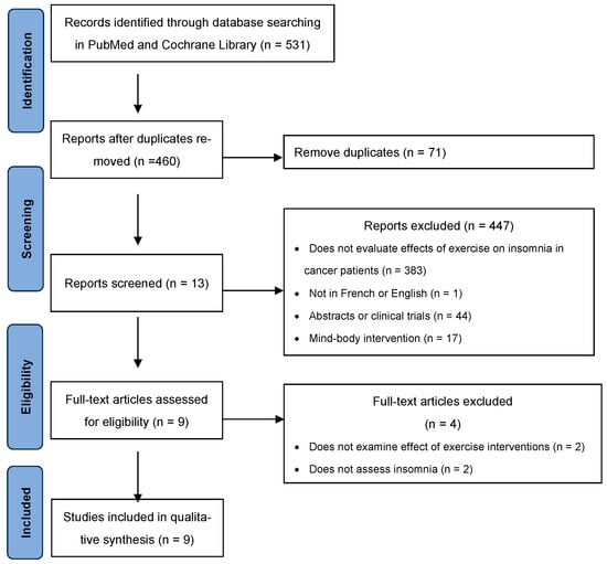 A total of 531 records, published in PubMed (n = 327) and Cochrane Library (n = 204) were screened. After removal of 71 duplicates, 460 were initially screened. Of these 460 papers, 447 were excluded based on our exclusion criteria (Figure 1). The full text of the remaining thirteen articles was retrieved and reviewed, but four of these were subsequently excluded because either the effects of exercise intervention or insomnia were not assessed. A final total of nine studies were included in the review.