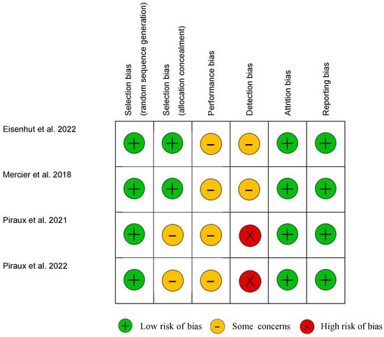 The risk of bias for RCTs is summarized in Figure 2. All studies had a low risk of bias for random sequence generation, attrition and selective outcome reporting. Two studies had insufficient information for allocation concealment. The four RCTs did not have sufficient information to determine the risk of bias for performance and detection, excepted a high risk in studies by Piraux et al. [28,29] about the blinding of the outcome assessment.