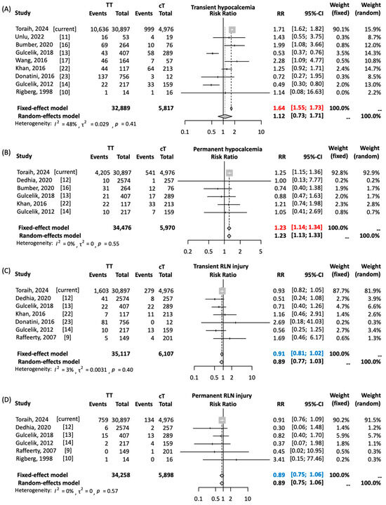 Risk of postoperative complication rates in total versus completion thyroidectomy in patients with well-differentiated thyroid cancer. (A) Risk of transient hypocalcemia. (B) Risk of permanent hypocalcemia. (C) Risk of transient recurrent laryngeal nerve (RLN) injury. (D) Risk of permanent RLN injury. Toraih’s 2024 study includes the current TriNetX analysis. Pairwise comparison was performed using Mantel–Haenszel method with DerSimonian–Laird estimator. Results are reported as relative risk (RR) and 95% confidence interval (CI). Due to absence of heterogeneity, results of fixed-effects model are reported. Red values indicate significant risk. Blue values indicate non-significant pooled estimates [9,10,11,12,13,14,16,17,22,23].