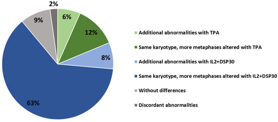 Regarding the global performance, our study confirmed that CBA of IL2+DSP30 cultures achieved higher alteration detection rates than those of TPA-based cultures. In accordance with previous studies, IL2+DSP30 stimulation also allowed us to obtain a higher proportion of abnormal metaphases in the majority of the patients showing alterations in both cultures [11,15]. Moreover, both methods identified a similar distribution of aberrant chromosomal regions, mostly including abnormalities that were previously well-defined in CLL (e.g., 11q-, +12, 13q-, IGH rearrangements, 17p aberrations) among a broad spectrum of abnormalities along the whole genome. The percentage of abnormal cases found using IL2+DSP30 obtained herein (50%) is lower than the approximately 80% described in the initial studies, which allowed the introduction of this combination in CLL routine practice [12,14]. Nonetheless, it is important to note that most of the large CBA studies using IL2+DSP30 in unselected CLL cohorts, or in patients at diagnosis, also showed similar taxes of abnormal karyotypes, ranging from 52 to 68% of the whole cohort [6,11,15,18]. Hence, this variance could be associated with intrinsic differences in the clinical characteristics of the assessed cohorts rather than with technical issues. In accordance, the percentage of aberrations detected in the present study could be influenced by the cohort composition, which was highly enriched in newly diagnosed CLL patients at the Binet A stage with indolent disease and including patients with CLL-like monoclonal B cell lymphocytosis.