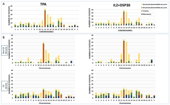 (A) Distribution of chromosomal abnormalities detected using TPA and IL2+DSP30 in the global cohort. (B) Distribution of chromosomal abnormalities detected using TPA and IL2+DSP30 in non-CK and CK groups. Patients were considered complex if a CK was detected in at least one of the cytogenetic cultures.
