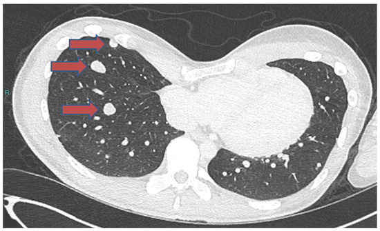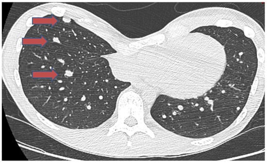 A chest CT scan, one year after denosumab treatment, showing a reduction in the size of 3 nodules and calcification marked by red arrows.