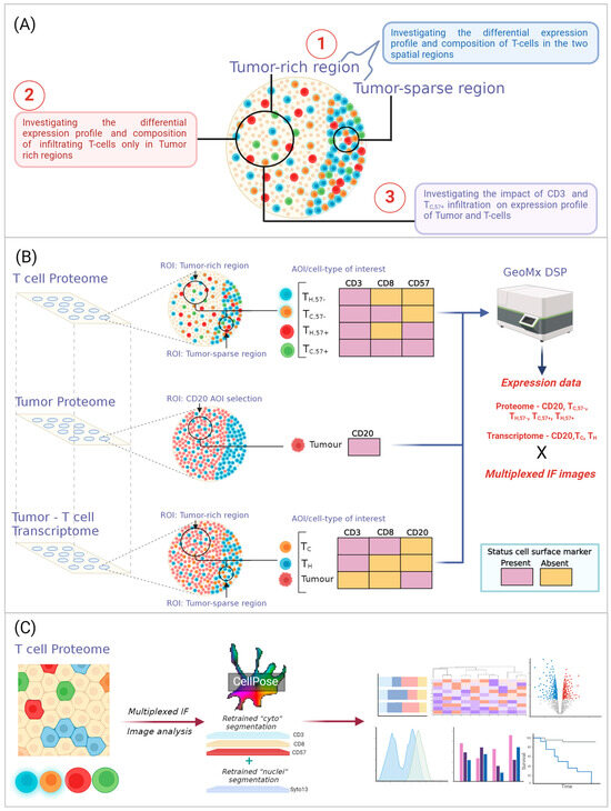 The first step of the spatial omics workflow includes the visualization of cells of interest in the tissue. Sections (4–7 μm thick) of the TMA were fixed on glass slides (Superfrost plus). Sections from each of the three TMA blocks were stained for mIF and scanned at 20X in the GeoMx instrument (Nanostring, Seattle, WA, USA) to collect (1) T-cell protein data, (2) MCL tumor protein data and (3) tumor B- and T-cell transcriptome data. Information on antibody clones is provided in Supplementary Materials Table S2. All antibodies went through detailed optimization to determine the optimal concentration for the tissue used and staining was performed according to established protocols available from Nanostring (https://university.nanostring.com including MAN-10087-07, MAN-10089-06, and MAN-10116-04 for v2.2 SW all from February 2021). To visualize cells of interest, a tissue section was stained with (1) CD3, CD8, CD57 and nuclear counterstain Syto13, to identify four T-cell subtypes of interest: TC,57− (CD57− CD3+ CD8+ early-stage differentiated T cytotoxic cells), TH,57− (CD57− CD3+ CD8− early-stage differentiated T helper cells), TC,57+ (CD57+ CD3+ CD8+ late-stage differentiated T cytotoxic cells) and TH,57+ (CD57+ CD3+ CD8− late-stage differentiated T helper cells) (Figure 1B, middle panel). The presence of double negative T cells (CD4− and CD8−) is rare (<3%), justifying the definition of T helper cells by the absence of CD8 on CD3+ cells [15]. A second tissue section was stained with (2) the tumor/B-cell markers CD20, CD3 and Syto13 to allow the visualization of two spatially defined regions, the tumor-rich and tumor-sparse regions where transcripts/proteins were quantified. From this section, protein data were collected from CD20+ cells (Figure 1). For spatial transcriptomics, a third tissue section was stained with (3) CD20, CD3 and CD8 (Supplementary Materials Table S2) to identify malignant CD20+ tumor cells, TC (cytotoxic T cells, CD3+ CD8+) and TH (helper T cells, CD3+ CD8−).