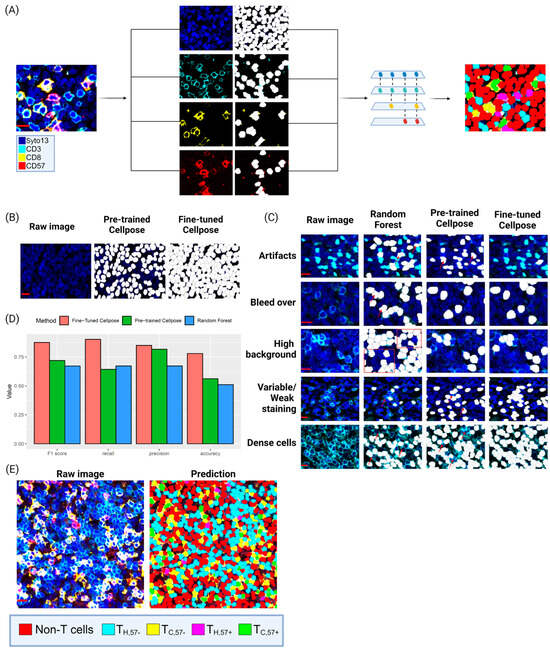 A retrained image segmentation/classification pipeline was used to classify cells. (A) Composite mIF image and the four channels separated with predicted segmentation masks. The segmentation masks generated from the fine-tuned Cellpose models were overlapped and projected to classify individual cells based on appearance of an individual marker. (B) Pre-trained vs. fine-tuned Cellpose nuclei model showing the output of the nuclei segmentation performance when the model weights are updated based on project-specific images. (C) Depiction of the improved performance in cell segmentation and classification of fine-tuned Cellpose cyto models (Panel 4) in comparison to pre-trained Cellpose models (Panel 3). A secondary model was developed using the masks from fine-tuned Cellpose nuclei model which was expanded to the cell boundary and a random forest classifier was trained to distribute the cells into the T-cell subtypes (Panel 2). (D) Quantitative comparison of F1 score, recall (sensitivity), precision and accuracy of the three models applied to a subset (n = 11) of cropped images. (E) Example of final segmentation and classification of cells into the four T-cell subtypes based on the defined workflow. Scalebar is 10 µm for all sub-figures but (E) that is 20 µm.
