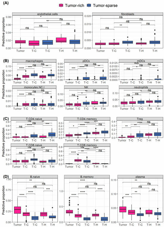 Deconvolution analysis investigating the predicted cell subtypes from tumor and T-cell AOIs. Boxplots show pairwise Wilcoxon analysis of cell types identified by deconvolution on paired (n = 25) transcriptome data. Data from tumor cells, and TC and TH in both tumor-rich and tumor-sparse regions were included in the analysis. Pink boxes indicate data sampled in tumor-rich regions, and blue boxes indicate data sampled in tumor-sparse regions. (A) Endothelial cells and fibroblasts, (B) macrophages, mDCs, monocytes (NCI, non-classical), neutrophils, NK and pDCs, (C) CD4+ memory T cells, CD4+ naïve T cells, CD8+ memory T cells, CD8+ naïve T cells, regulatory T cells, (D) naïve B cells, memory B cells and plasma B cells. ns, non-statistical significance, * p < 0.05, ** p < 0.01, *** p < 0.001, **** p < 0.0001.