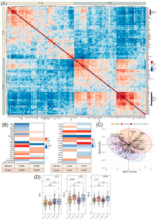 Unique proteomic characteristics of each of the T-cell subsets, TC,57−, TH,57−, TC,57+ and TH,57+, were determined using multi group comparisons. In total, 26 differentially expressed proteins were identified (Figure 6B and Supplementary Materials Table S11 and Figure S5B–F). The PCA biplot shows the contribution of the 26 proteins in segregating the four T-cell subtypes, particularly the overall TC and TH subsets (Figure 6C).