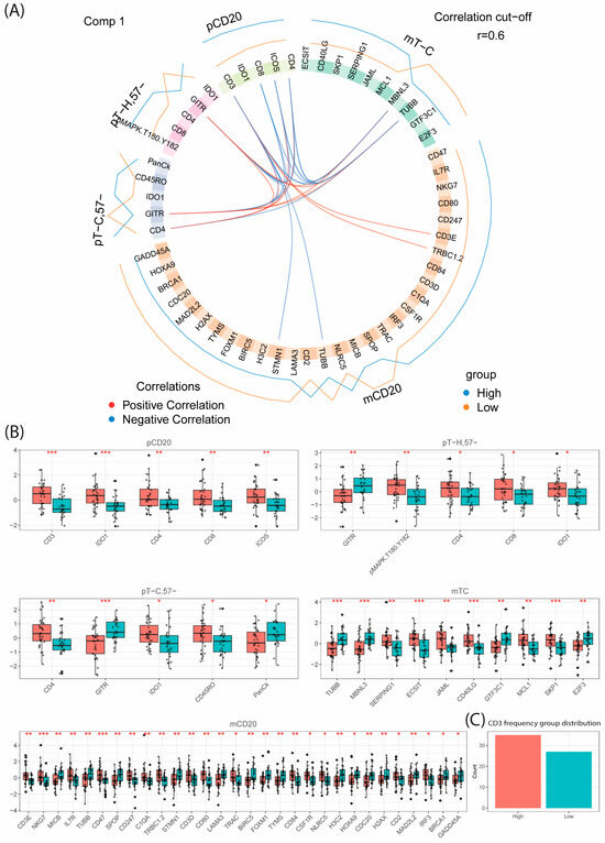 Multi-omics investigation of TIME with respect to infiltrating CD3 T-cell frequency using DIABLO. DIABLO prefers complete datasets, and to include relevant number of patients only five out of eight collected omics datasets were used resulting in data from n = 62 patients. Proteomic datasets included CD20 (pCD20), TH (pTH) and TC (pTC). Transcriptomic data included CD20 (mCD20) and TC (mTC). (A) Circos plot highlighting the identified analytes in each omics dataset for the optimally selected first component. The outer blue and red lines indicate the direction of the association between the individual parameter (gene or transcript) and the CD3 frequency group (high or low, cut-of 8.4%). The inner lines connect parameters with positive (red) or negative (blue) association-based correlation analogues to Pearson (R > ±0.6). The groups were determined based on optimal cut-off for high/low CD3 T-cell infiltration based on survival analysis in Supplementary Materials Figure S4. (B) Boxplot analysis with t-test significance per omics dataset of the analytes identified in (A). * p < 0.05, ** p < 0.01, *** p < 0.001. (C) Bar plot distributions of the high (n = 35) and low (n = 27) infiltration groups used for this analysis.