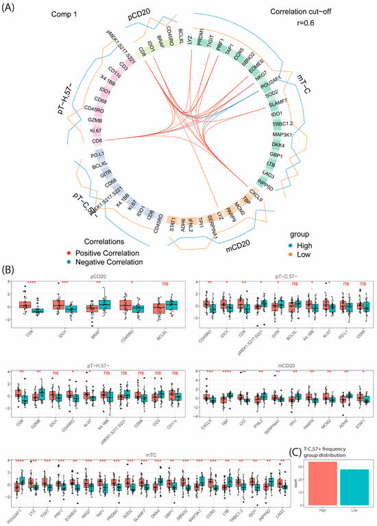 Multi-omics investigation of TIME with respect to infiltrating TC,57+ frequency using DIABLO. DIABLO prefers complete datasets, and to include a relevant number of patients only five out of eight collected omics datasets were used, resulting in data from n = 62 patients. Proteomic datasets included CD20 (pCd20), TH (pTH) and TC (pTC). Transcriptomic data included CD20 (mCD20) and TC (mTC). (A) Circos plot highlighting the identified analytes in each type of omics data for the optimally selected first component. The outer blue and red lines indicate the direction of the association between the individual parameter (gene or transcript) and the TC,57+ frequency group (high or low, using median = 0.686% as cut-off). The inner lines connect parameters with positive (red) or negative (blue) association-based correlation analogues to Pearson (R > ±0.6). (B) Boxplot analysis with t-test significance per type of omics data of the analytes identified in (A). (C) Bar plot distribution of the high (n = 34) and low (n = 28) infiltration groups used for this analysis. ns, non-statistical significance, * p < 0.05, ** p < 0.01, *** p < 0.001, **** p < 0.0001.