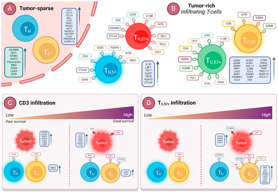Summary of results. (A) Proteins (green box) and transcripts (purple box) upregulated in tumor-sparse regions (data shown over pink background) compared to tumor-rich regions. (B) Key proteins displayed on surface of the individual cells and mRNAs (purple boxes) on each T-cell subset. The left box refers to upregulated transcripts in TH subsets and the right box refers to upregulated transcripts in TC subsets. (C) Main proteins and mRNAs predictive of high or low CD3+ T-cell infiltration. Purple boxes indicate upregulated transcripts in each indicated cell type. (D) Main proteins and mRNAs predictive of high or low TC,57+ infiltration. Purple boxes indicate differentially upregulated mRNAs in each indicated cell type. Biorender.com was used to create the illustrations.