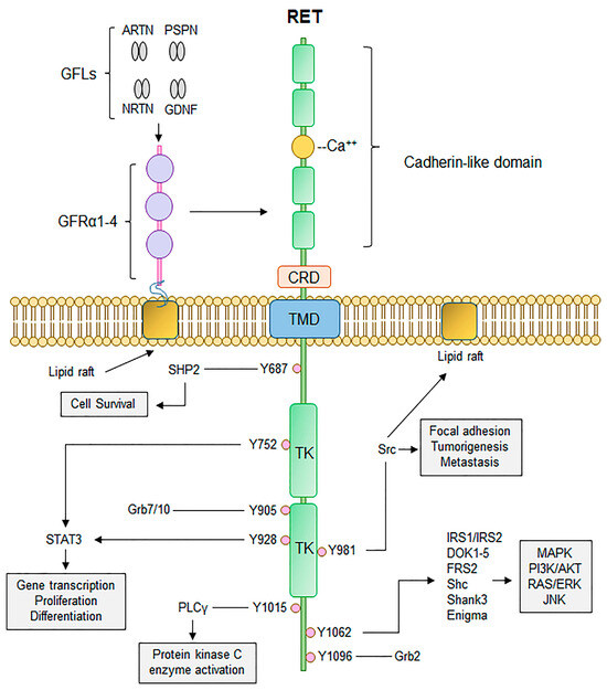 Canonical RET signalling. RET activation occurs upon fulfilment of multiple steps. Binding of GDNF-family ligands (GFLs), to co-receptor GFRα1-4, concurrently with binding of calcium ions to the calcium binding domain, induces recruitment of RET, forming RET-GFRα complex. Formation of RET-GFRα complex brings two RET monomers in close proximity to induce homodimerization and cross phosphorylation of key RET tyrosine residues that recruit adaptor proteins important for propagation of RET signalling, such as PI3K/AKT, MAPK, and RAS/RAF/ERK. Thus, activation of RET signalling ultimately promotes cell proliferation, growth, and survival through activation of multiple downstream signalling cascades. CRD, cysteine-rich domain; TMD, transmembrane domain; TK, tyrosine kinase domain. Adapted from [12]. Published under a Creative Commons Attribution (CC BY) License.