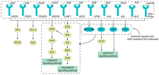 The variety of surface tyrosine kinase receptors that play an important role in the maintenance of cellular homeostasis, through regulation of intracellular signalling pathways. The final effector pathways can be activated by several surface receptors, as well as by other intracellular activation pathways, highlighting the inherent difficulty in achieving sustained therapeutic efficacy through the blockade of a particular tyrosine kinase receptor. Adapted from [118]. Published under a Creative Commons Attribution (CC BY) License.