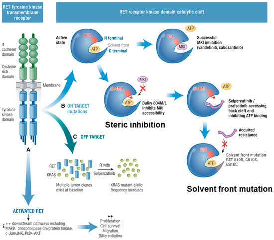 Mechanisms of MKI resistance. RET tyrosine kinase transmembrane receptor has constitutive activation due to RET point mutations leading to downstream pathway activation. (A) Resistance mechanisms are described. (B) On target: the RET receptor kinase domain catalytic cleft is activated when ATP causes phosphorylation. MKIs (vandetanib, cabozantinib) can hinder the ATP binding when there is no V804M/L mutation with bulky hydrophobic side chains: steric inhibition. Acquired solvent front mutations RET G810R, G810S, G810C hinder this binding rendering selpercatinib ineffective. (C) Off Target mutations are shown with multiple tumour clones existing at baseline, reduction in RET, and subsequent increase in KRAS (or MET) allelic frequency. Adapted from [121]. Published under a Creative Commons Attribution (CC BY) License.