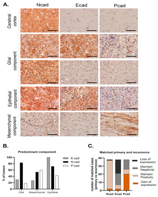 When evaluating for distinct neuropathological phenotypes, we observed that tumors with a predominant sarcomatous/mesenchymal differentiation predominantly exhibited N- and P-cadherin co-expression (44.4%) or were positive for the three cadherins (33.3%) or expressed only P-cadherin (11.1%) or only N-cadherin (11.1%) (p < 0.001) (Figure 3B). Predominant epithelial differentiation was observed in tumors showing only E-cadherin expression (28.6%), E- and N-cadherin co-expression (28.6%) and the expression of the three cadherins (triple-positive, 42.9%) (p < 0.001) (Figure 3B). Tumors with predominant glial expression most frequently had only N-cadherin expression (46.1%), E- and N-cadherin co-expression (21.5%) or were negative for the three cadherins (13.5%) (Figure 3B).