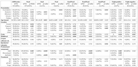 When considering the combined expression of the three cadherins, we further evaluated putative significant correlations with clinical, imaging and neuropathological characteristics. Clinical presentation was associated with cadherin co-expression profiles (Figure 2). In particular, patients with tumors that expressed epithelial cadherins more frequently presented focal deficits (P-cadherin, p = 0.024 and co-expression of E- and P-cadherin, p = 0.018), while headache was the most common presentation in patients with tumors that showed isolated E-cadherin expression (p = 0.015). These expression profiles also correlated with age; specifically, the isolated expression of E-cadherin was more common in younger patients (p = 0.015). Tumor location was more common in the frontal lobe for isolated N-cadherin expression tumors (p = 0.024) and the temporal lobe for the co-expression of E- and N-cadherin (p = 0.022). Other imaging features correlated with cadherin expression subgroups included cyst formation (co-expression E- and N-cadherin, p < 0.001, and a tendency for E-cadherin, p = 0.057), multifocality (P-cadherin expression, p = 0.011, and co-expression P- and N-cadherin, p = 0.024), ependymal extension (P-cadherin expression, p = 0.030, and E- and P-cadherin co-expression, p = 0.036), and corpus callosum extension (tendency for P- and N-cadherin co-expression, p = 0.055).