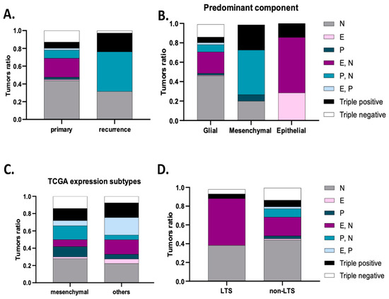 Cadherins’ expression subgroups in glioblastoma. (A) Compared to primary tumors, the most frequent subgroups in recurrent tumors are P- and N-cadherin co-expression (46.2%) and N-cadherin expression (30.8%). (B) Tumors with a predominant epithelial component expressed E-cadherin, E- N-cadherin or triple-positive subgroups. For mesenchymal tumors, the subgroups expressed were P- N-cadherin, triple-positive, P-cadherin and N-cadherin. (C) Analysis of data from the TCGA data confirmed a main expression of P- and N-cadherin, N-cadherin, triple-positive and N-cadherin subgroups in the mesenchymal transcriptional subtype. P- and N- co-expression significantly correlated with the mesenchymal subtype (p = 0.033). (D) Tumors from long-term survival patients more frequently exhibited E- and N-cadherin co-expression, N-cadherin, triple-positive or triple-negative subgroups (p = 0.013).