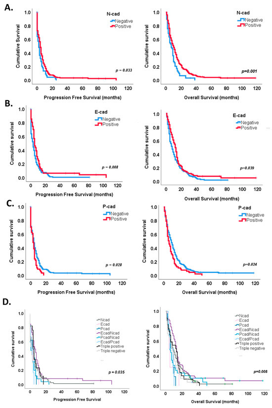 In particular, N-cadherin expression identified tumors with improved progression-free survival (median 6 months, log rank test, p = 0.033) and overall survival (median 12 months, log rank test, p = 0.001) (Figure 4A), while a significant decrease in progression-free survival and overall survival was observed in tumors positive for P-cadherin expression (log rank test, median 3 months and 7 months, p = 0.028 and p = 0.024, respectively) (Figure 4C). E-cadherin staining identified tumors with a longer time to recurrence (7 months, log rank test, p = 0.008) and a better overall survival (14 months, log rank test, p = 0.039) (Figure 4B).