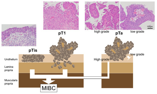 Regarding the mutational profiles of NMIBC, T1 tumors are more closely related to MIBC than Ta tumors; nonetheless, the mutational profiles of T1 tumors often contain both Ta-like and MIBC-like features [52]. There is no absolute pathogenic pathway for the progression from NMIBC to MIBC; these tumor categories involve nonoverlapping pathways [53,54]. Figure 1 summarizes the correlation between the pathological findings of NMIBC and the progress to MIBC.