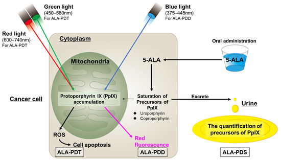 PpIX accumulates in the mitochondria in the cancer cells. The excess PpIX causes the saturation of the porphyrin precursors of PpIX (i.e., uroporphyrins and coproporphyrins) and promotes their excretion into the blood and urine, thus raising their amounts in cancer patients. Photodynamic screening (PDS) is performed to measure the levels of these precursors [83]. Figure 2 summarizes the mechanisms of ALA-PDD, -PDT, and -PDS.