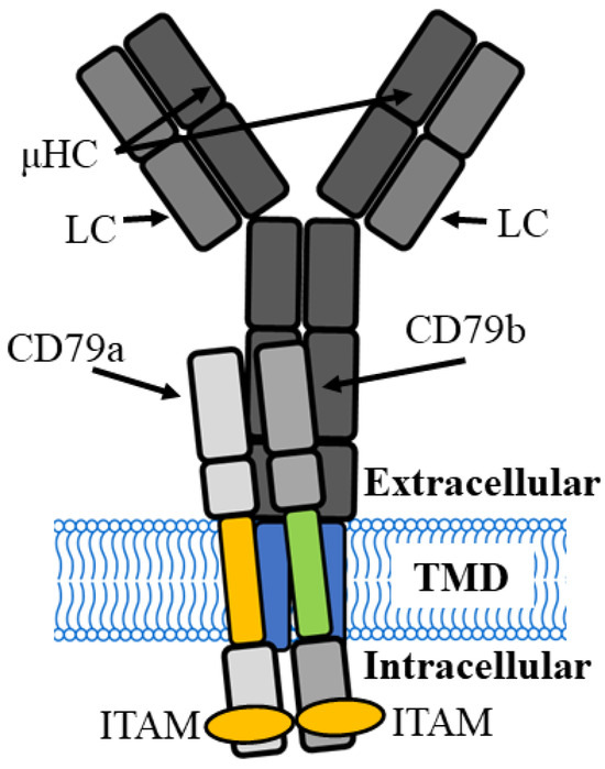B cell receptor complex of the immature B cell has two µ heavy chains (µHC) combined with two light chains (LC) to form a membrane-bound, antigen-binding immunoglobulin M (IgM) that interacts with a CD79a and CD79b signalling module. TMD, transmembrane domain, ITAM, immunoreceptor tyrosine-based activation motifs.
