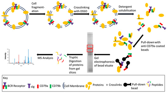 In brief, the method was adapted from Bartolec et al. and Klykov et al. [14,15] and uses the hypotonic lysis technique with suspension of the cells in HLB and freeze/thawing described above. A stock solution of 50 mM DSSO in dimethyl sulfoxide was prepared and was immediately added to the lysed cell suspension to a final concentration of 5 mM and incubated at RT for 30 min. The crosslinking reaction was quenched by adding TRIS to a final concentration of 10 mM and incubating for 15 min. The cytosolic fraction was separated from the membrane fraction as described previously, and the membrane-bound proteins were solubilized with the MS-compatible detergent 0.5% DOC lysis buffer. Agarose bead pull-down enrichment was undertaken as described above, using anti-CD79a antibody, and the bead eluate was subjected to SDS PAGE (as described above). Protein bands were visualized using Coomassie Blue staining [16].