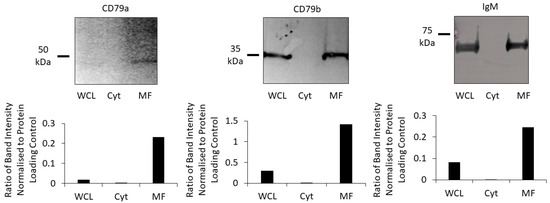 Image J software version 1.54 h was used to quantify total protein load in each lane by first inverting the colours and then calculating the area under the curve which was representative for each lane. The corresponding bands for the CD79a, CD79b and IgM lanes were quantified in a similar manner. The result for each blot was represented as a ratio normalized to the protein concentration of each lane, to allow meaningful comparison across lanes.