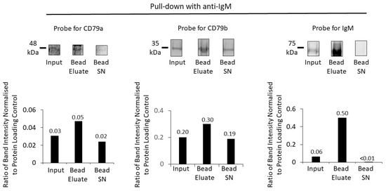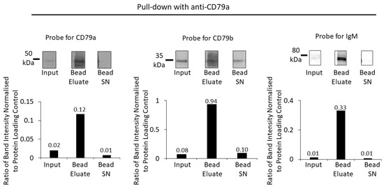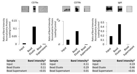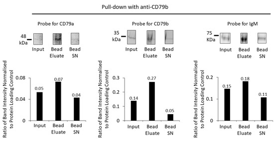 Anti-CD79a antibody pull down using the membrane fraction solubilized in 0.5% DOC buffer. CD79a, CD79b and IgM were detected using Western blotting in the membrane fraction, bead eluate and bead supernatant. All three components are enriched in the bead eluate. * Ratio of band intensity normalised to protein-loading control.