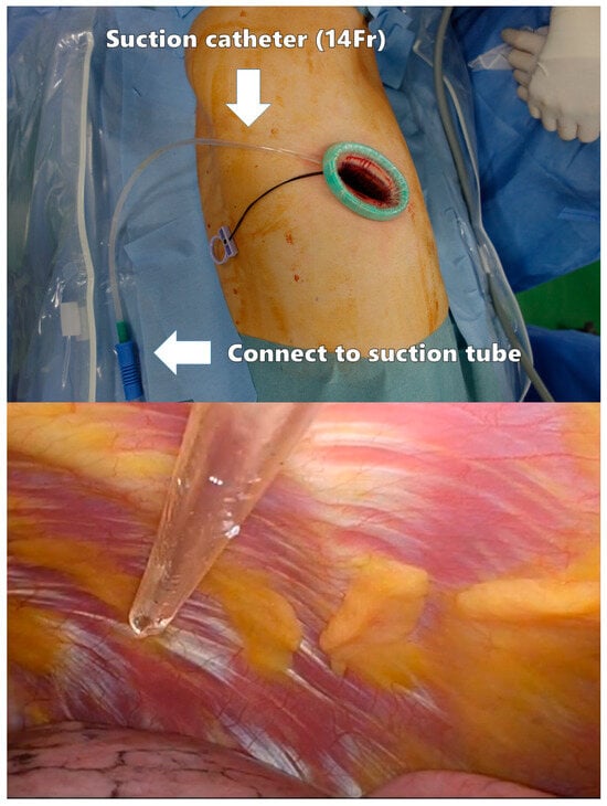 A polyurethane retractor is placed on the wound to protect the intercostal space. A 14-Fr suction catheter is inserted through the edge of the retractor as a smoke evacuation device (Figure 3). This method has been reported to significantly reduce intraoperative camera clearing []. As the suction device does not need to be placed in the thoracic cavity, the left hand can be tubeless.