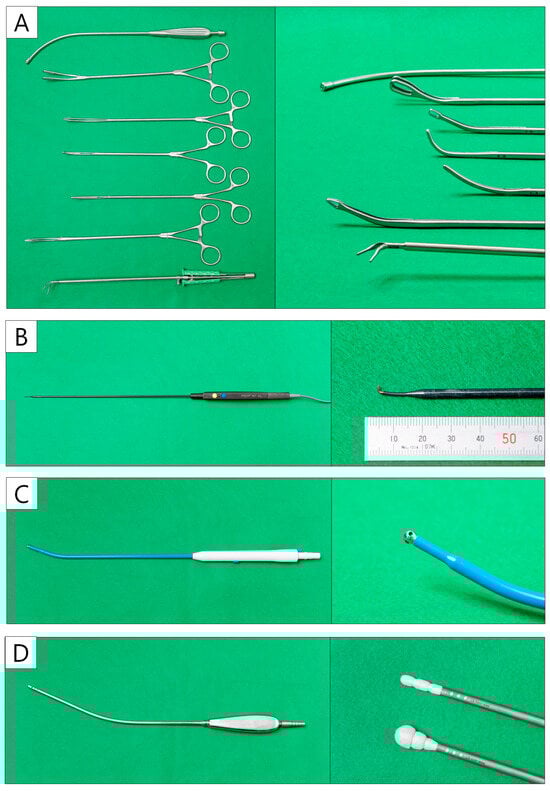 Several curved forceps need to be prepared, including suction tools, lung forceps, lymph node forceps, right-angle forceps, Kelly forceps, snake forceps, and curved forceps (Figure 4A). The thoracoscope is ENDOEYE (Olympus, Tokyo, Japan) with a 5 mm 30-degree rigid integrated scope. Energy devices are essential in U-VATS, although surgeons can choose their own devices according to their preferences. The first author frequently uses a 1 mm wide hook-type electrocautery scalpel, AdTec® mini (B.BRAUN AESCULAP, Melsungen, Germany) (Figure 4B) for the incision of vessels and bronchial sheaths. A 23 cm curved suction soft coagulator (AMCO, Tokyo, Japan) (Figure 4C) is also useful for dissection and hemostasis. The left hand is mainly used with the CS Two-Way HandleTM (Unimedic, Osaka, Japan) (Figure 4D). It is also useful for compression hemostasis in cases with oozing []. They are characterized by greater friction than suction instruments, making it easier to adjust the tension. Techniques using these instruments are presented with surgical videos in the segmentectomy case series section.
