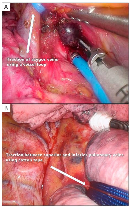 Owing to the limited number of tools available for U-VATS, lymph node dissection (LND) needs to be designed. In a sub-analysis of JCOG0802, the frequency of upstaging (N2) by LND was 0.5% in part-solid tumors, whereas N2 was identified in 5.4% of pure-solid tumors. Therefore, selective LND is recommended [,]. There are also reports of a good prognosis in cases where more than 10 lymph nodes were dissected in segmentectomy [], and in U-VATS segmentectomy, LND should be performed appropriately according to the case. For the dissection of the N1 lymph nodes, a sharp incision should be made through the vascular or bronchial sheath, and the lymph nodes should be dissected under the surrounding capsule; hook electrocautery is useful for sharp incisions in U-VATS (Video 1). The careful dissection of the N1 lymph nodes without crushing is particularly important to ensure curability in U-VATS segmentectomy for early-stage NSCLC. For superior mediastinal LND, dissection around the azygos vein before dissecting the superior trunk (A3) eliminates the need for an assistant to protect the A3 stump. The azygos vein can be taped and towed by an assistant to provide a good surgical field for LND (Figure 5A). For inferior mediastinal LND, a good surgical field around the tracheal bifurcation can be obtained by passing tape between the superior and inferior PVs and towing the entire lower lobe forward (Figure 5B). For this reason, inferior mediastinal LND is performed before cutting the inferior PV and inferior lobe bronchus during lower lobectomy.