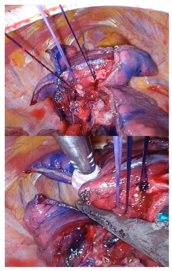 This is the most important step in U-VATS segmentectomies. Specifically, in cases where the tumor is not visible from the pleura, it is necessary to depend on preoperative markings to determine the appropriate staple line to ensure the tumor margin. All peripheral stumps of the dissected intersegmental PV or (sub) segmental bronchus are ligated and towed. The control of these threads facilitates stapling between the intersegmental planes (Figure 6). After stapling the intersegmental planes, the specimen should be thoroughly palpated. The staples should be removed and bled off to facilitate palpation. If no tumor is palpable in the specimen, the surgeon should not hesitate to convert to thoracotomy and palpate the lung again, even if the surgery is almost complete.
