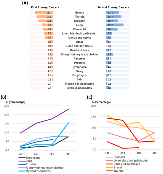 In the age group of 19–49 years, the most common second primary cancer is thyroid cancer (24.3%), followed by breast cancer (23.1%) and uterus/cervix cancer (8.2%). For those aged 50–59 years, lung cancer (16.0%) and thyroid cancer (14.8%) are predominant, with breast cancer also being significant (12.1%). In the 60–69-year age group, lung cancer remains the most frequent (19.3%), followed by colorectal cancer (CRC) (11.7%) and stomach cancer (11.4%). Among individuals aged 70–79 years, lung cancer continues to be prevalent (20.9%), with stomach cancer (14.8%) and CRC (11.5%) also notable. Finally, in the over-80-year age group, stomach cancer (16.1%), lung cancer (16.1%), and prostate cancer (16.1%) are the leading second primary cancers (Table 3).