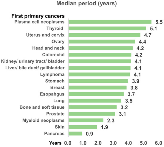 Median period (years) to multiple primary cancers by type of first primary cancer.